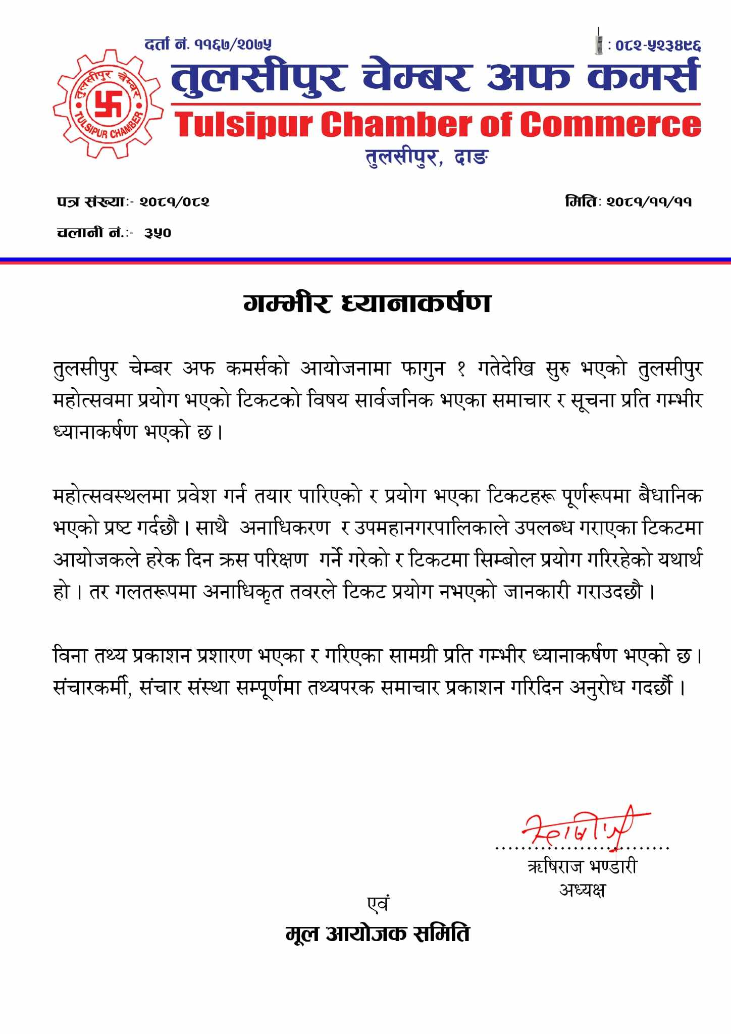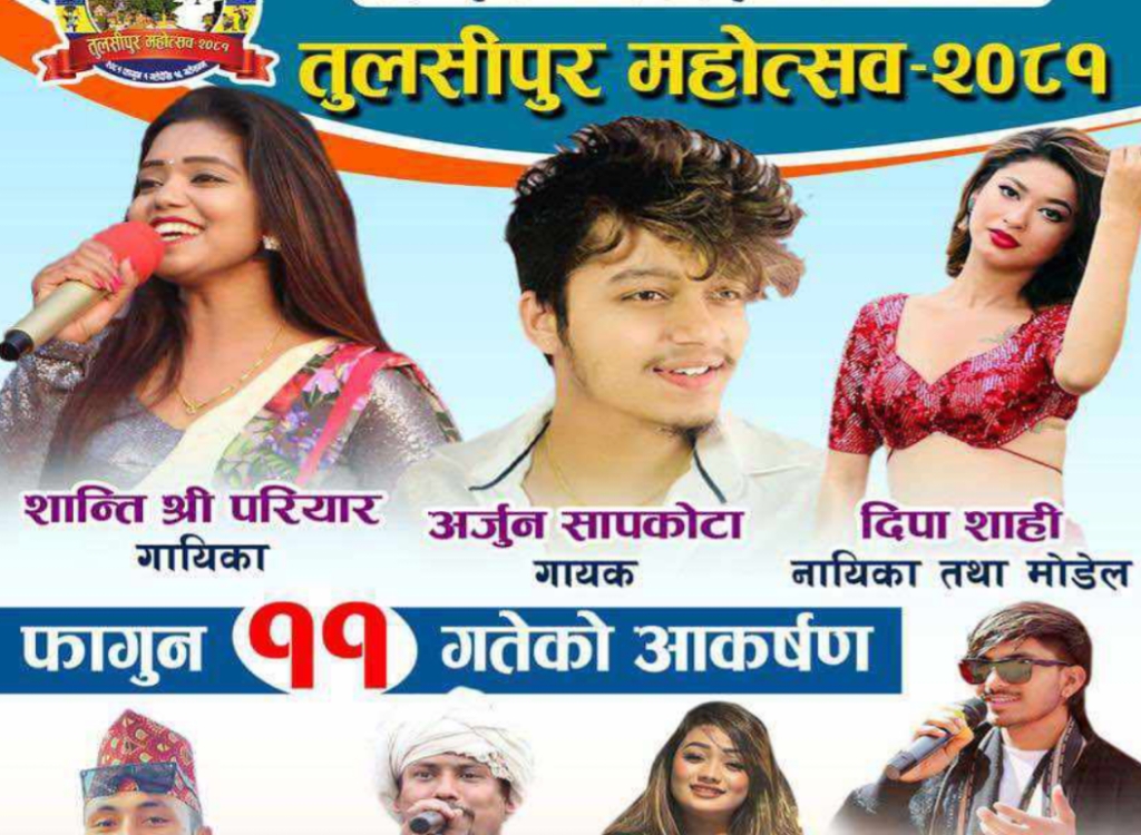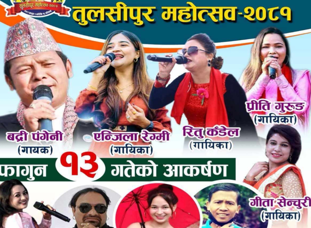 दाङ । तुलसीपुरमा दोस्रो तुलसीपुर महोत्सव जारी छ । दिनप्रतिदिन राष्ट्रिय तथा स्थानीय कलाकारको प्रस्तुतिले महोत्सवको रौनकता बढ्दै गएको छ । महोत्सवको आज १३ औँ दिन पनि चर्चित लोक गायक बद्री पंगेनीको प्रस्तुतीले दर्शकहरु रमाएका छन् । पंगेनीको प्रस्तुतीले महोत्सवमा दर्शकको रुवावासी चल्थ्यो । तर आज उनको प्रस्तुतीमा दर्शकहरु छमछमती नाचेका छन् । ‘बद्री पंगेनी […]