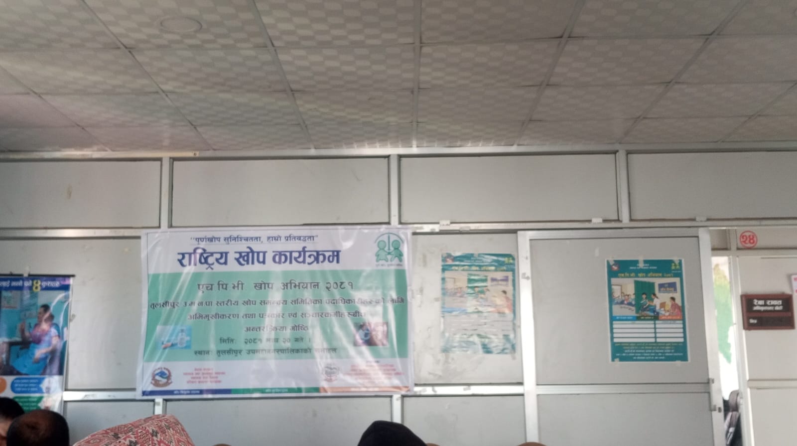 तुलसीपुर । तुलसीपुर उपमहानगरपालिकामा ११ हजार ३ सय ३९ जना किशोरीलाई एचपिभी (ह्युमन प्यापिलोमा भाइरस) खोप लगाइने भएको छ । तुलसीपुर उपमहानगरपालिकाकाे आयोजनामा महिला पाठेघरकाे मुखकाे क्यान्सर विरुद्धकाे खाेप अभियान सञ्चालन तथा व्यवस्थापनकाे बिषयकाे अन्तरक्रिया कार्यक्रममा खाेप सम्बन्धी जानकारी गराएको थियोे ।