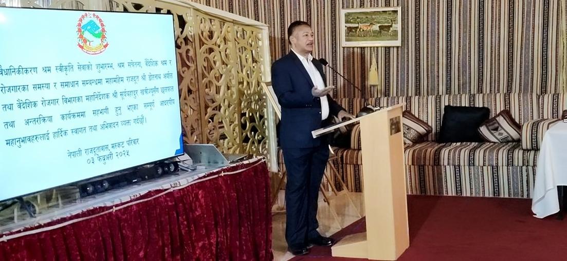 विभिन्न माध्यमबाट ओमान पुगेका तर श्रम स्वीकृति नभएका नेपालीलाई राजदूत डोरनाथ अर्याल र वैदेशिक रोजगार विभागका महानिर्देशक सूर्यबहादुर खत्रीले संयुक्त रुपमा श्रम स्वीकृति प्रदान गरे ।