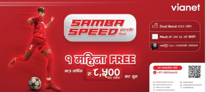 दाङ । इन्टरनेट सेवा प्रदायक भायानेट कम्युनिकेशन लिमिटेडले सेवाग्राहीहरुको लागि नयाँ अफर ल्याएको छ । चर्चित नेपाल महिला राष्ट्रिय फुटबल टोली खेलाडी साम्बाबाट प्रेरित इन्टरनेट योजना उच्च गतिको भरपर्दो एक महिना फ्रि सहितको नयाँ अफर ‘साम्बा प्याक’ सार्वजनिक गरेको हो ।
