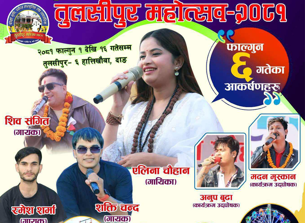 दाङ। तुलसीपुरमा जारी दोस्रो कृषि, पर्यटन, सांस्कृतिक तथा व्यावसायिक महोत्सव-२०८१ मा चर्चित कलाकारहरू धमाकेदार प्रस्तुति दिन आउने भएका छन्। “स्वरोजगार, आत्मनिर्भरता हाम्रो आधार, शहरदेखि गाउँसम्म व्यापार विस्तार” भन्ने नाराका साथ सुरु भएको महोत्सवमा आज कलाकारहरुको गायनसंगै हास्यव्यंग्य प्रस्तुति समेत रहने छ। महोत्सवको फागुन ११ गतेको विशेष आकर्षणका रूपमा चर्चित लोकदोहोरी गायिका शान्तिश्री परियार, अर्जुन सापकोटा, […]
