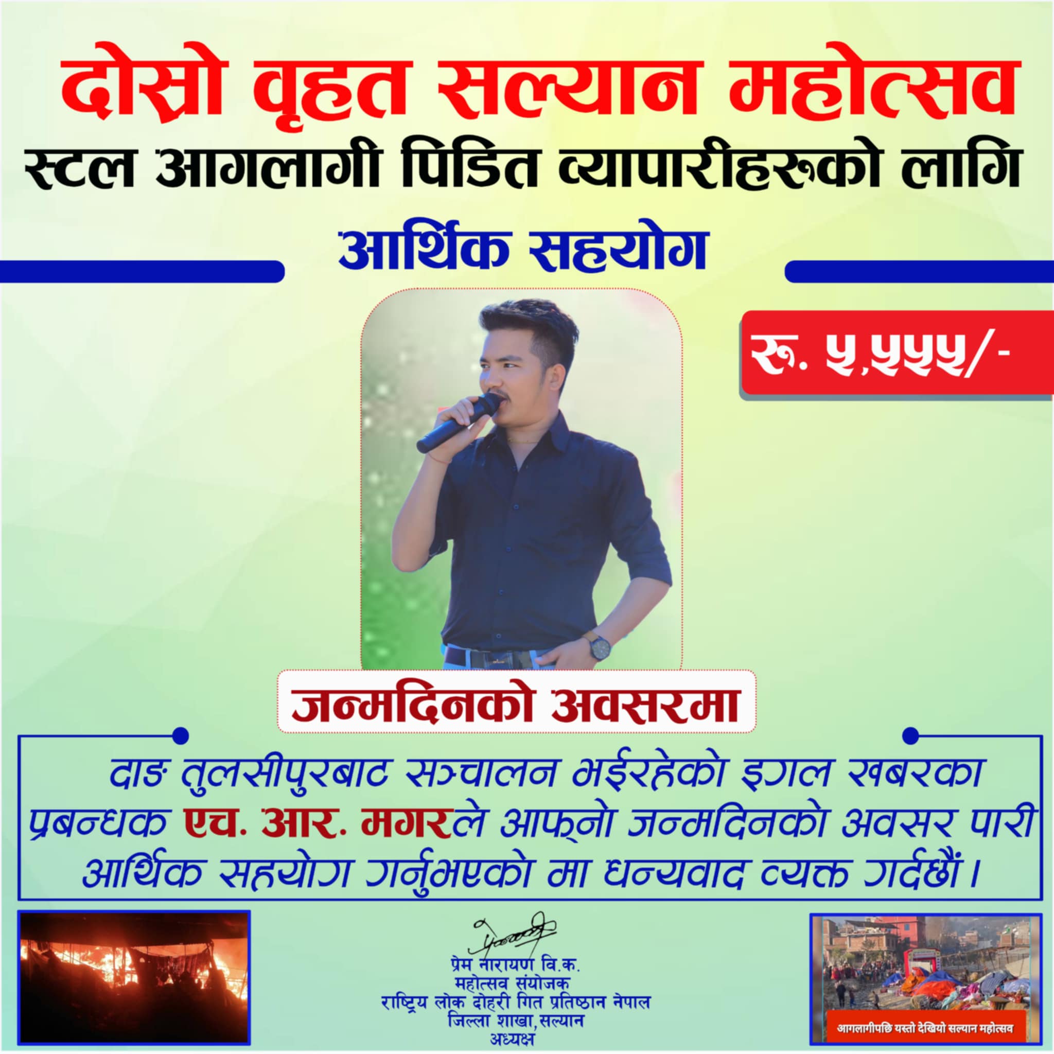 दाङ । दाङको तुलसीपुरबाट सञ्चालन भइरहेको इगल खबरका प्रबन्ध एच.आर. मगरले आफ्नो जन्मदिनको अवसरमा आगलागी पीडितहरूलाई आर्थिक सहयोग गरेका छन् । सल्यानमा जारी दोस्रो वृहत सल्यान महोत्सवको स्टलमा भएको आगलागी पीडितहरूलाई आफ्नो जन्मदिनको अवसरमा नगद सहयोग गरेका हुन् ।  आगलागीबाट करोडौँको क्षति हुँदा व्यवसायीहरू पीडामा रहेको अवस्था उनीहरूलाई थोरै भएपनि राहत पुगोस्, भन्ने उद्देश्यले ५ […]